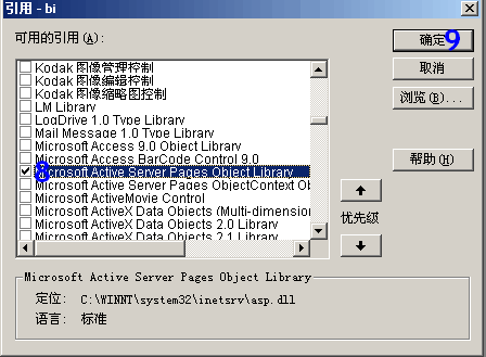 點(diǎn)擊引用,然后選擇其中的Microsoft Active Server Pages Object Library.