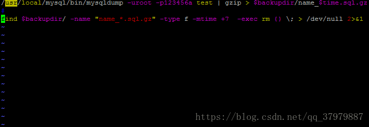 #!/bin/bash# Name:name.sh# This is a ShellScript For Auto DB Backup and Delete old Backupbackupdir=/root/application/bak/mysqldatatime=` date +%Y%m%d%H `/usr/local/mysql/bin/mysqldump -u root -p123456a test | gzip > $backupdir/name1$time.sql.gzfind $backupdir -name "name_*.sql.gz" -type f -mtime +7 -exec rm {} /; > /dev/null 2>&1/usr/local/mysql/bin/mysqldump 這個是我的MySQL路徑是這里,指定MySQL的bin里的mysqldump程序來執行,backupdir是sql備份文件的文件夾-uroot就是數據庫用戶是root 然后-p123456a就是數據庫密碼是123456a 然后test是數據庫名,后面$都是引用前面聲明,$time.sql這是創建sql文件,find就是找文件 $backupdir后面必須要有/ 不然找不到 然后-name這些就找文件名了-mtime +7是每隔7天刪除一次,我們等下測試每分鐘備份一次所以要刪除7分鐘之前的文件,所以用-mmin +7 所以腳本就建好了。