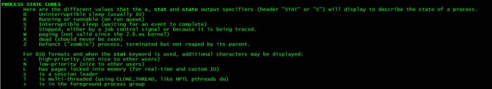 D 不可中斷 Uninterruptible sleep (usually IO) R 正在運行,或在隊列中的進程 S 處于休眠狀態 T 停止或被追蹤 Z 僵尸進程 W 進入內存交換(從內核2.6開始無效) X 死掉的進程 < 高優先級 N 低優先級 L 有些頁被鎖進內存 s 包含子進程 + 位于后臺的進程組; l 多線程,克隆線程 multi-threaded (using CLONE_THREAD, like NPTL pthreads do)