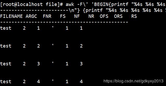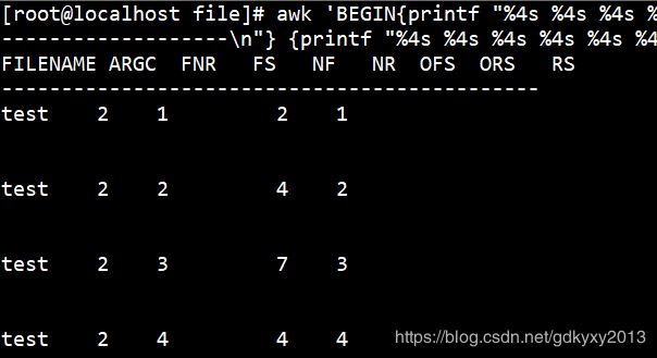 awk 'BEGIN{printf "%4s %4s %4s %4s %4s %4s %4s %4s %4s/n","FILENAME","ARGC","FNR","FS","NF","NR","OFS","ORS","RS";printf "---------------------------------------------/n"} {printf "%4s %4s %4s %4s %4s %4s %4s %4s %4s/n",FILENAME,ARGC,FNR,FS,NF,NR,OFS,ORS,RS}' test