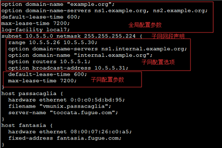 標(biāo)準(zhǔn)的DHCP配置文件包括全局配置參數(shù)、子網(wǎng)網(wǎng)段聲明、地址配置選項以及地址配置參數(shù):