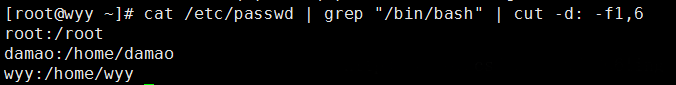 cat /etc/passwd | grep "/bin/bash" | cut -d: -f1,6 #cut -d: -f1,6 表示以:為分隔符顯示第1和第6列的內容-d指定分隔符,-f指定列