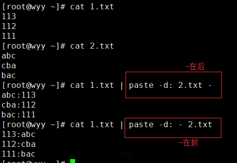 cat 1.txt | paste -d: 2.txt -#paste -d: 2.txt - 表示以:為分割符合并兩個文件,合并時2.txt文件的內容在前 -代表1.txt文件