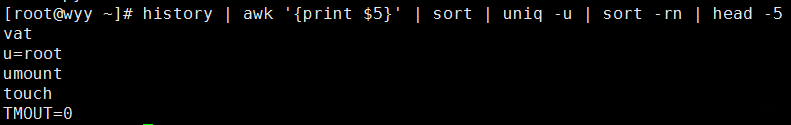 history | awk '{print $2}' | sort | uniq -u | sort -rn | head -5