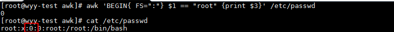 awk 'BEGIN{ FS=":"} $1 == "root" {print $3}' /etc/passwd #以":"為分隔符,打印/etc/passwd中第一列是root的行其第3列的內容