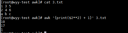awk '{print ($2**2) +1}' 3.txt #將3.txt文件中第二列內容做平方運算后再加1輸入(字符串做平方運算后結果為0)