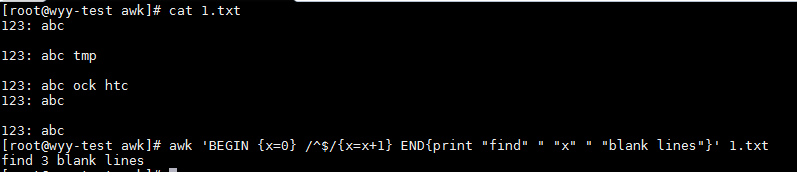 awk 'BEGIN { x=0 } /^$/{x=x+1} END{print "find" " " x " " "blank lines"}' 1.txt #統計1.txt中有多少空行