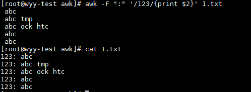 awk -F ":" '/123/{print $2}' 1.txt #以":"為分隔符打印1.txt中匹配123的那一行中,第二列的內容