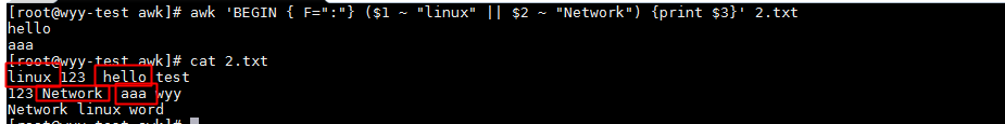 awk 'BEGIN {FS=":"} ($1 ~ "linux" || $2 ~ "Network") {print $3}' 1.txt # 以":"為分隔符,打印1.txt文件中,第一列匹配linux或者第二列匹配Network的行,其第三列的內容
