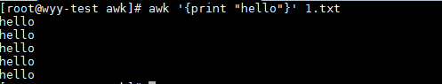 awk '{print "hello"}' 1.txt #逐行讀取1.txt文件內容,每行結束后打印一個hello,文件1.txt有多少行就打印多少個hello
