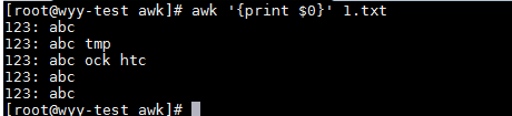 awk '{print $0}' 1.txt #逐行讀取文件內容,并打印該行,$0保存的是當前行的內容