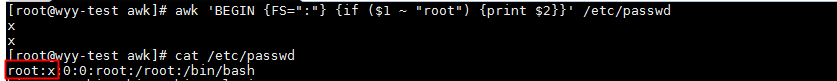 awk 'BEGIN {FS=":"} {if ($1 ~ "root") {print $2}}' /etc/passwd # 以":"為分隔符,打印/etc/passwd文件中第一列匹配root的行,其第二列的內容