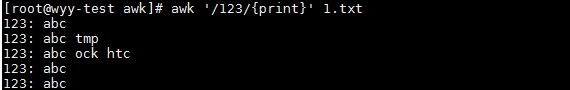 awk '/123/{print}' 1.txt #打印1.txt中匹配123的那一行內容