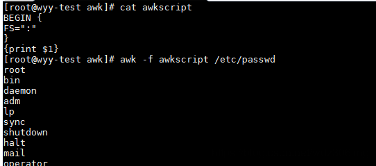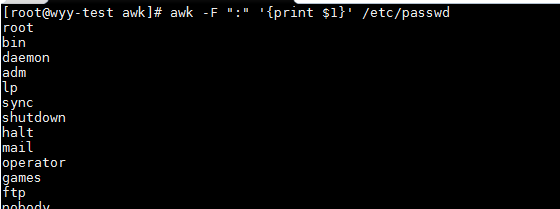 awk -F ":" '{print $1}' /etc/passwd #以":"為分隔符打印/etc/passwd文件的第一例內容