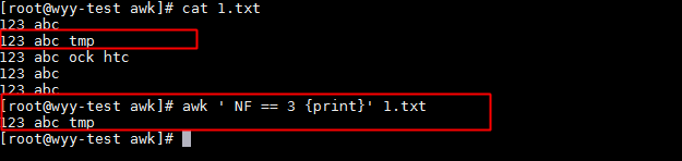 awk 'NF == 3 {print}' 1.txt #打印1.txt中有3列的行的內容,示例中,第二行有三列,所以打印的就是第二行的內容