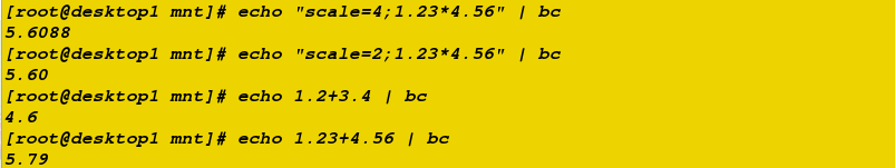 echo "scale=4;1.23*4.56" | bc ##scale表示小數點后幾位echo "scale=2;1.23*4.56" | bcecho 1.2+3.4 | bcecho 1.23+4.56 | bc