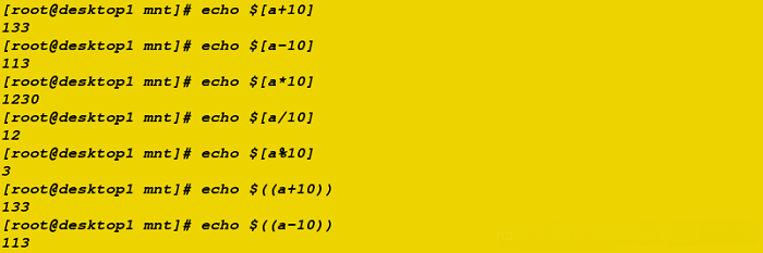 echo $[a+10]echo $[a-10]echo $[a*10]echo $[a/10]echo $[a%10]echo $((a+10))echo $((a-10))