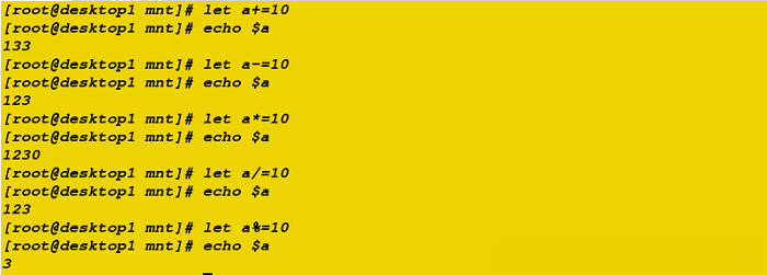let a+=10echo $alet a-=10echo $alet a*=10echo $alet a/=10echo $alet a%=10echo $a