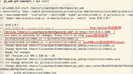 "scripts": { "test": "echo /"Error: no test specified/" && exit 1", "start": "concurrently 'sass --watch pc/static/scss:pc/static/css mobile/static/scss:mobile/static/css --sourcemap=none' 'live-server --port=1208' 'babel pc/static/es6-js -d pc/static/js --watch' 'babel mobile/static/es6-js -d mobile/static/js --watch' 'echo 好好工作!'" },運行效果