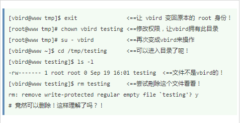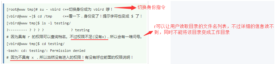 注意:要開發目錄給任何人瀏覽時,應該至少要給予r和x權限,w不可以隨便給;x在目錄中與能否進入該目錄有關