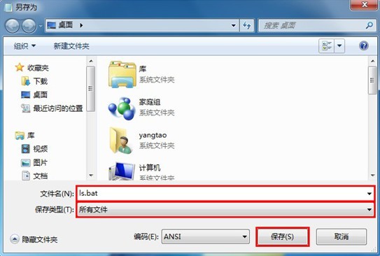 2.接下來,將該新建文檔“另存為”,并命名為“ls.bat”,保存類型為“所有文件”,然后,點擊“保存”按鈕即可。