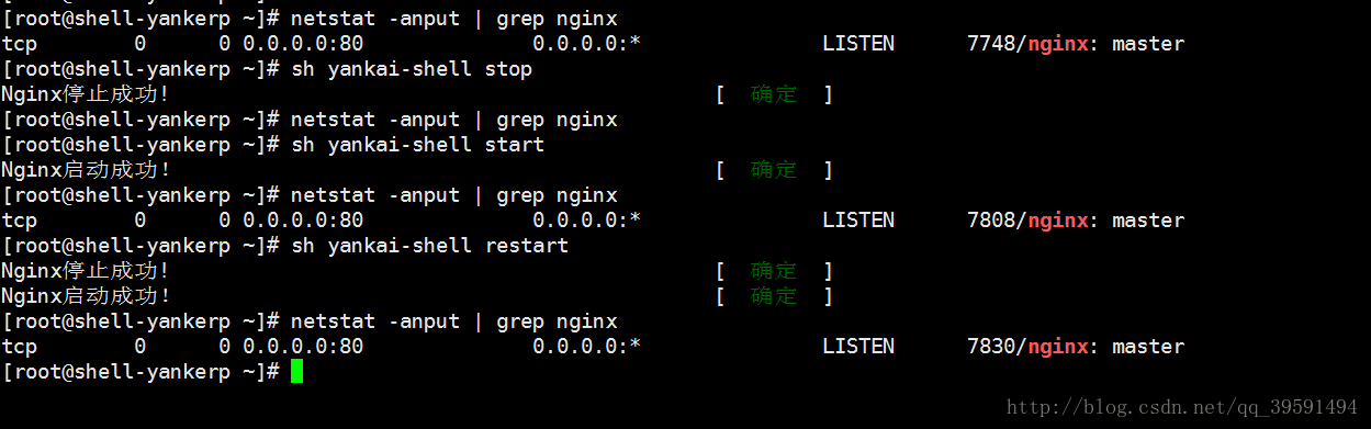 #!/bin/bash BASE_DIR=/usr/local/nginx/sbin/ PID=/usr/local/nginx/logs/nginx.pid #no1.判斷是否root用戶登錄 if [ "$UID" -ne 0 ] then echo "請您使用root用戶登錄?。?!" exit 1 fi . /etc/init.d/functions #判斷用戶輸入的傳參個數 if [ "$#" -ne 1 ] then echo "/bin/bash $0 {start|stop|restart}" exit 1 fi #編寫啟動Nginx函數 function start (){ if [ `netstat -anput | grep nginx | wc -l` -eq 0 ] then $BASE_DIR/nginx fi if [ "$?" -eq 0 ] then action "Nginx啟動成功!" /bin/true else action "Nginx啟動失敗!" /bin/false fi } #編寫停止Nginx函數 function stop (){ if [ `netstat -anput | grep nginx | wc -l` -ne 0 ] then $BASE_DIR/nginx -s stop fi if [ "$?" -eq 0 ] then action "Nginx停止成功!" /bin/true else action "Nginx停止失敗!" /bin/false fi } #編寫case語句 使用特殊的位置變量$1來判斷用戶輸入的內容 case $1 in start) start ;; stop) stop ;; restart) stop start ;; esac 運行如下: