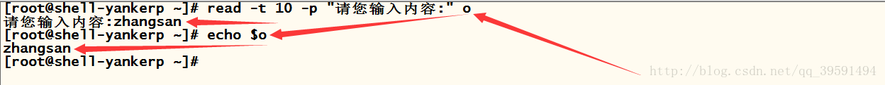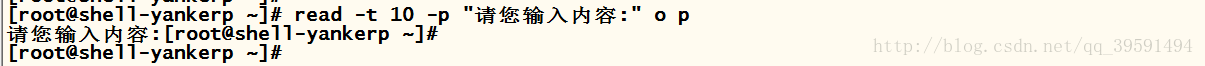 [root@shell-yankerp ~]# read -t 10 -p "請您輸入內容:" o p 請您輸入內容:zhangsan lisi [root@shell-yankerp ~]# echo $o zhangsan [root@shell-yankerp ~]# echo $p lisi [root@shell-yankerp ~]#