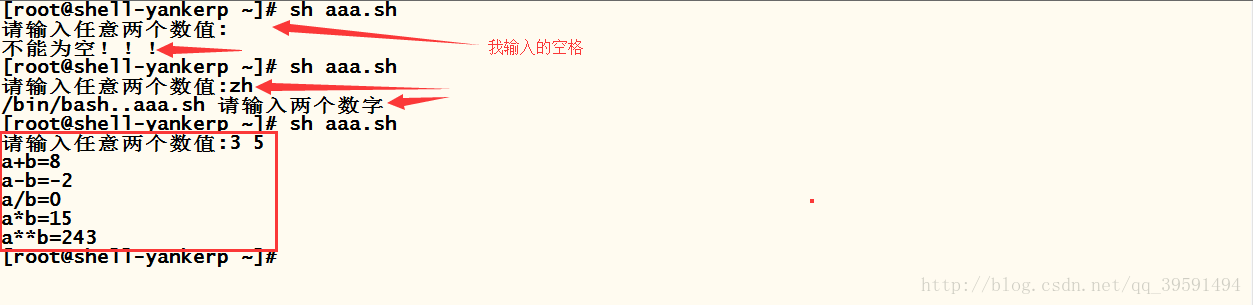 #!/bin/bash read -t 10 -p "請輸入任意兩個數值:" a b expr $a + 1 &>/dev/null if [ "$?" -ne "0" ] then echo /bin/bash..$0 "請輸入兩個數字" exit 1 fi [ ${#a} -le 0 ] && { echo "不能為空?。。? exit 1 } [ ${#b} -le 0 ] && { echo "不能為空!??!" exit 1 } echo "a+b=$((a+b))" echo "a-b=$((a-b))" echo "a/b=$((a/b))" echo "a*b=$((a*b))" echo "a**b=$((a**b))" 剖析:
