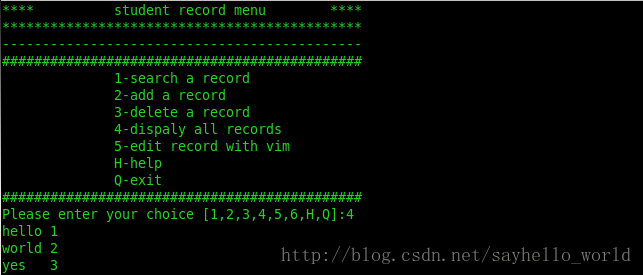 #! /bin/bash#查詢函數search(){ clear echo -e "Please enter name >>>/c" read NAME #如果記錄為空 if [ ! -f ./record ];then echo "you must have some scores before you can search!" sleep 2 clear return fi #沒有輸入名字進行查詢 if [ -z "$NAME" ];then echo "you didn't enter a name!" echo -e "Please enter name >>>/c" read NAME fi grep -i "$NAME" ./record 2> /dev/null case "$?" in 1) echo "Name not in record." ;; 2) echo "you didnt eter a name to search"; sleep 2; search;; esac}#增加信息add(){ clear echo "Enter name and score of a record" echo -e "/c" if [ ! -f ./record ];then touch record fi read NEWNAME #關于輸出重定向,>代表覆蓋式的寫入 ,>>代表添加式的寫入 echo "$NEWNAME" >>./record sort -o ./record ./record}#刪除學生信息delete(){ clear echo -e "Please enter delete name" read NAME if [ ! -f ./record ];then echo "this name is not in record" else cp record record.bak rm -f record grep -v "$NAME" ./record.bak > record rm -f record.bak fi}#顯示所有的記錄函數display(){ more ./record}#利用vim編輯器編輯函數edit(){ vim ./record}#屏幕幫助操作help(){ clear echo "this is a student record program by unix shell language!"}#推出程序quit(){ clear exit}clearwhile truedo echo "*********************************************" echo "**** student record menu ****" echo "*********************************************" echo "---------------------------------------------" echo "#############################################" echo " 1-search a record " echo " 2-add a record " echo " 3-delete a record " echo " 4-dispaly all records " echo " 5-edit record with vim " echo " H-help " echo " Q-exit " echo "#############################################" echo -e -n "Please enter your choice [1,2,3,4,5,6,H,Q]:/c" read CHOICE case $CHOICE in 1) search;; 2) add; clear;; 3) delete; clear;; 4) display;; 5) edit; clear;; H|h) help;; Q|q) quit;; *) echo "Invailid choice!"; sleep 2; clear;; esac done