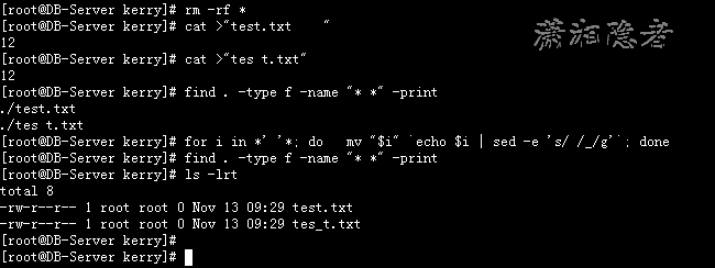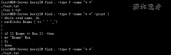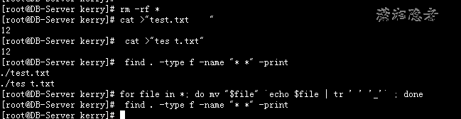 [root@DB-Server kerry]# [root@DB-Server kerry]# rm -rf *[root@DB-Server kerry]# cat >"test.txt "123456[root@DB-Server kerry]# for file in *' '*; do mv "$file" `echo "$file" | sed -e 's/ /n/g'`; done[root@DB-Server kerry]# find . -type f -name "* *" -print