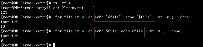 [root@DB-Server kerry]# rm -rf *;[root@DB-Server kerry]# cat >"test.txt "123[root@DB-Server kerry]# for file in *; do echo "$file"; echo "$file" | wc -m ; done;test.txt 13[root@DB-Server kerry]# for file in *; do echo $file; echo $file | wc -m ; done;test.txt9[root@DB-Server kerry]#