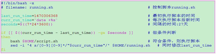 1) 每天定時執行running.sh腳本,再在腳本running.sh里面判斷,當間隔時間滿足條件時