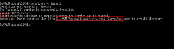 3.使用httpd.exe -k install安裝Apache.這時候會報服務器路徑錯誤: