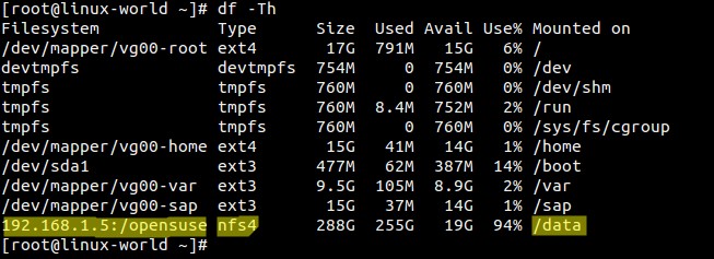 [root@linux-world ~]# df -t nfs4Filesystem 1K-blocks Used Available Use% Mounted on192.168.1.5:/opensuse 301545472 266833920 19371008 94% /data[root@linux-world ~]#