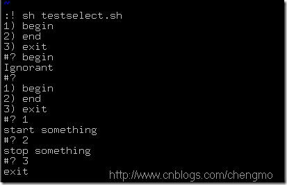 select ch in "begin" "end" "exit"