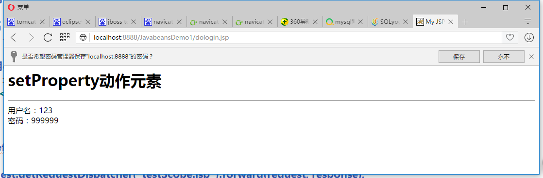 <%@ page language="java" import="java.util.*" contentType="text/html; charset=utf-8"%><%String path = request.getContextPath();String basePath = request.getScheme()+"://"+request.getServerName()+":"+request.getServerPort()+path+"/";%> <!DOCTYPE HTML PUBLIC "-//W3C//DTD HTML 4.01 Transitional//EN"><html> <head> <base href="<%=basePath%>" rel="external nofollow" rel="external nofollow" > <title>My JSP 'dologin.jsp' starting page</title> <meta http-equiv="pragma" content="no-cache"> <meta http-equiv="cache-control" content="no-cache"> <meta http-equiv="expires" content="0"> <meta http-equiv="keywords" content="keyword1,keyword2,keyword3"> <meta http-equiv="description" content="This is my page"> <!-- <link rel="stylesheet" type="text/css" href="styles.css" rel="external nofollow" rel="external nofollow" > --> </head> <body> <jsp:useBean id="myUsers" class="com.po.Users" scope="page"/> <h1>setProperty動作元素</h1> <hr> <!--根據表單自動匹配所有的屬性 --> <%-- <jsp:setProperty name="myUsers" property="*"/> --%> <!--根據表單匹配所有部分的屬性 --> <%-- <jsp:setProperty name="myUsers" property="username"/> --%> <!--根表單無關,通過手工賦值給屬性 --> <%-- <jsp:setProperty name="myUsers" property="username" value="lisi"/> <jsp:setProperty name="myUsers" property="password" value="888888"/> --%> <!--通過URL傳參數給屬性賦值 --> <jsp:setProperty name="myUsers" property="username"/> <jsp:setProperty name="myUsers" property="password" param="mypass"/> <!-- 使用傳統的表達式方式來獲取用戶名和密碼 --> 用戶名:<%=myUsers.getUsername() %><br> 密碼:<%=myUsers.getPassword() %><br> <br> <br> </body></html>