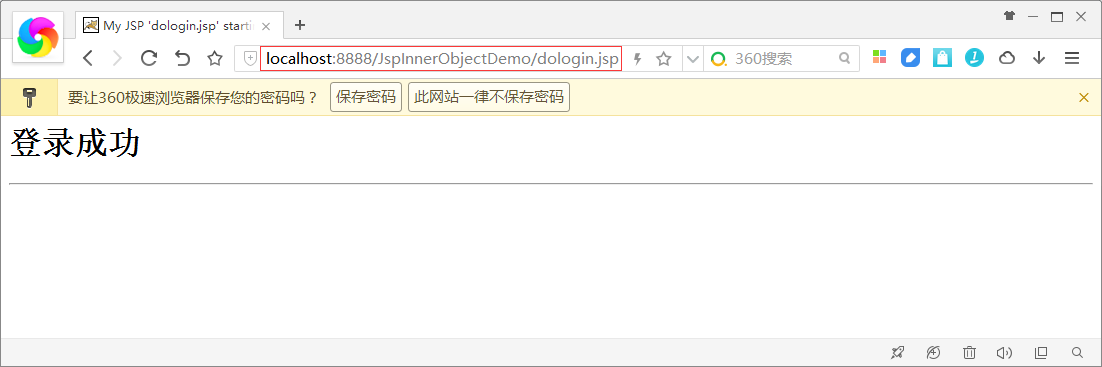 <%@ page language="java" import="java.util.*" contentType="text/html; charset=utf-8"%><%String path = request.getContextPath();String basePath = request.getScheme()+"://"+request.getServerName()+":"+request.getServerPort()+path+"/";%> <!DOCTYPE HTML PUBLIC "-//W3C//DTD HTML 4.01 Transitional//EN"><html> <head> <base href="<%=basePath%>" rel="external nofollow" rel="external nofollow" > <title>My JSP 'dologin.jsp' starting page</title> <meta http-equiv="pragma" content="no-cache"> <meta http-equiv="cache-control" content="no-cache"> <meta http-equiv="expires" content="0"> <meta http-equiv="keywords" content="keyword1,keyword2,keyword3"> <meta http-equiv="description" content="This is my page"> <!-- <link rel="stylesheet" type="text/css" href="styles.css" rel="external nofollow" rel="external nofollow" > --> </head> <body> <h1>登錄成功</h1> <hr> </body></html>