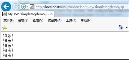 最后就能在JSP頁面的主體中使用剛才定義好的帶屬性的簡單標簽了,使用“count”屬性就能指定標簽體循環的次數: