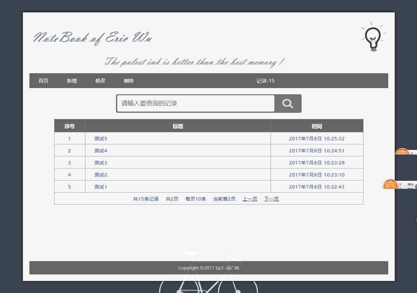 <%@page import="Bean.DBBean"%><%@page import="Entity.Record"%><%@page import="java.util.List"%><%@ page language="java" contentType="text/html; charset=UTF-8" pageEncoding="UTF-8"%><!DOCTYPE html PUBLIC "-//W3C//DTD HTML 4.01 Transitional//EN" "http://www.w3.org/TR/html4/loose.dtd"><html><head><meta http-equiv="Content-Type" content="text/html; charset=UTF-8"><title>NoteBook of Eric Wu</title> <link rel="stylesheet" href="css/basic.css" rel="external nofollow" > <link rel="stylesheet" href="css/index.css" rel="external nofollow" ></head><body><% int allRecord=0;//總的記錄條數,不包含查詢后的 int totalRecord=0;//總的記錄條數,包含查詢后的 int totalPage=1;//總的頁面數,包含查詢后的 int pageIndex=1;//當前頁面號,用于控制頁面翻轉,默認為1 List<Record> records=null; DBBean db=new DBBean(); allRecord=db.getRecordCount(); totalRecord=db.getRecordCount(); totalPage=(totalRecord-1)/10+1; if(request.getParameter("pageIndex")!=null){//不是第一次加載 //要做下數據類型轉換 pageIndex=Integer.valueOf(request.getParameter("pageIndex")); if(request.getParameter("keyword")!=null){ String keyword=request.getParameter("keyword"); records=db.getRecords(pageIndex,keyword);//獲取查詢內容一頁的事件記錄集,共10條 totalRecord=db.getRecordCount(keyword); totalPage=(totalRecord-1)/10+1; }else{ records=db.getRecords(pageIndex);//獲取一頁的事件記錄集,共10條 } }else{//第一次加載 records=db.getRecords(pageIndex);//獲取一頁的事件記錄集,共10條 } session.setAttribute("records", records);//便于后面使用%> <div id="home"> <div id="header"> <div id="WebTitle"> <div class="maintitle"><a href="index.jsp" rel="external nofollow" rel="external nofollow" target="_blank">NoteBook of Eric Wu</a></div> <div class="subtitle">The palest ink is better than the best memory !</div> </div> <div id="navigator"> <ul id="navList"> <li><a href="index.jsp" rel="external nofollow" rel="external nofollow" >首頁</a></li> <li><a href="add.jsp" rel="external nofollow" >新增</a></li> <li><a href="change.jsp" rel="external nofollow" >修改</a></li> <li><a href="delete.jsp" rel="external nofollow" >刪除</a></li> </ul> <div id="Stats"> 記錄-<%=allRecord %> </div><!--end: Stats 狀態--> </div><!-- end: navigator 導航欄 --> </div><!-- end: header 頭部 --> <div id="main"> <div id="content"> <form id="searchForm" name="searchForm" action="index.jsp" method="get"> <input type="hidden" name="pageIndex" id="pageIndex" value="1"> <div id="search"> <div class="center"></div> <input type="text" class="search" id="keyword" name="keyword" placeholder="請輸入要查詢的記錄"> <img src="img/search.jpg" onclick="searchKeyword();" class="button"> </div> </form> <table> <tr> <th width="10%">序號</th> <th width="60%">標題</th> <th width="30%">時間</th> </tr> <% int count=0; if(records!=null){ for(Record r: records){ count++; %> <tr> <td class="center"><%= count %></td> <td><a href="content.jsp?recordId=<%= r.getId() %>" rel="external nofollow" target="_blank"><%= r.getTitle() %></a></td> <td class="center"><%= r.getTime() %></td> </tr> <% } } %> <tr class="alt" > <td class="center" colspan="3"> 共<%= totalRecord %>條記錄 共<%= totalPage %>頁 每頁10條 當前第<%= pageIndex %>頁 <a href="javascript:void(0);" rel="external nofollow" rel="external nofollow" class="turnPage" onclick="turnTopPage()">上一頁</a> <a href="javascript:void(0);" rel="external nofollow" rel="external nofollow" class="turnPage" onclick="turnBottomPage()">下一頁</a> </td> </tr> </table> </div><!-- end: content 內容 --> </div><!-- end: main 主要部分 --> <div id="footer"> Copyright ©2017 汕大-吳廣林 </div><!-- end: footer底部--> </div><!-- end: home 自定義的最大容器 --></body><script type="text/javascript"> var pageIndex=<%=pageIndex %>; var totalPage=<%=totalPage %>; console.log(pageIndex); //上一頁 function turnTopPage(){ if(pageIndex==1){ return; }else{ document.getElementById("pageIndex").value=pageIndex-1; document.getElementById("searchForm").submit(); } } //下一頁 function turnBottomPage(){ if(pageIndex>=totalPage){ return; }else{ document.getElementById("pageIndex").value=pageIndex+1; document.getElementById("searchForm").submit(); } } function searchKeyword(){ document.getElementById("pageIndex").value=1; document.getElementById("searchForm").submit(); }</script></html>效果圖
