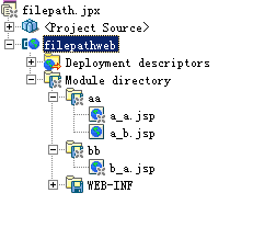 這是JBuilder2006下的一個截圖,應用的名字是filepathweb,有兩個文件夾,aa和bb,其中aa下有a_a.jsp和a_b.jsp兩個文件,bb下有b_a.jsp文件。