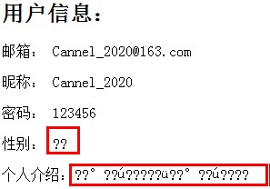 <%@ page contentType="text/html;charset=gb2312" %> <html> <head> <title>中文亂碼――JSP頁面傳遞中文參數時 </title> </head> <body> <center> <h2>用戶信息:</h2> <% String email = request.getParameter("email"); %> <% String nickname = request.getParameter("nickname"); %> <% String password = request.getParameter("password"); %> <% String sex = request.getParameter("sex"); %> <% String introduction = request.getParameter("introduction");%> <p>郵箱: <% out.print(email); %><p/> <p>昵稱: <% out.print(nickname); %><p/> <p>密碼: <% out.print(password); %><p/> <p>性別: <% out.print(sex); %><p/> <p>個人介紹:<%out.print(introduction); %></p> </center> </body> </html> 運行結果: