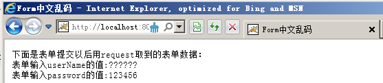 <%@ page language="java" import="java.util.*" contentType="text/html;charset=gb2312"%> <html> <head> <title>Form中文亂碼</title> </head> <body> <font size="2"> 下面是表單提交以后用request取到的表單數(shù)據(jù):<br> <% String userName = request.getParameter("userName"); String password = request.getParameter("password"); out.println("表單輸入userName的值:" + userName + "<br>"); out.println("表單輸入password的值:" + password + "<br>"); %> </font> </body> </html>在上面的程序中,如果表單輸入沒有中文,則可以正常的顯示當(dāng)輸入的數(shù)據(jù)中有中文的時(shí)候,得到的結(jié)果如圖所示。