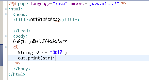 <%@ page language="java" import="java.util.*" contentType="text/html; charset=GB2312" %> <html> <head> <title>中文顯示示例</title> </head> <body> 這是一個(gè)中文顯示示例: <% String str = "中文"; out.print(str); %> </body> </html>