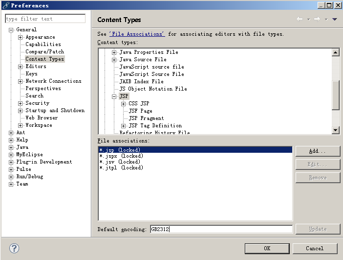 對于這個(gè)問題我們只需要更改一下Eclipse或者是MyEclipse中對JSP的默認(rèn)編碼就可以了,修改的地方(我的MyEclipse版本為11)如圖所示
