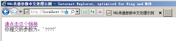 <%@ page language="java" import="java.util.*" contentType="text/html;charset=gb2312"%> <html> <head> <title>URL傳遞參數(shù)中文處理示例</title> </head> <% String param = request.getParameter("param"); %> <body> <a href="URLCharset.jsp?param='中文'">請點(diǎn)擊這個(gè)鏈接</a><br> 你提交的參數(shù)為:<%=param%> </body> </html> 上面這個(gè)JSP程序的功能就是通過一個(gè)URL鏈接向自身傳遞一個(gè)參數(shù),這個(gè)參數(shù)是中文字符串,這個(gè)程序的運(yùn)行效果如下圖