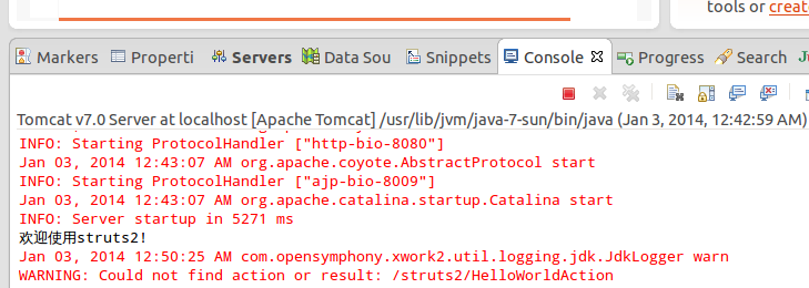 第六步:啟動tomcat,輸入http://localhost:8080/struts2/HelloWorldAction查看控制臺輸出