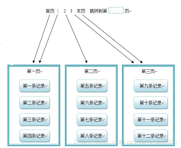 如果想要把頁面顯示做成這樣的效果,在這張圖中pageSize=4,pageCount=3,showPage=1,recordCount=12。思路是,如果要顯示那個頁面,就要先算出來每個頁面第一條記錄是所有記錄中的第幾條記錄,假設每頁的第一條記錄是總記錄中的第position條記錄,那么position=(ShowPage - 1)×PageSize+1。比如上圖這個例子,如果要顯示第一頁,就要計算出第一頁中的第一條記錄是總的記錄中的第一條記錄;如果要顯示第二頁,就要計算出第二頁中的第一條記錄是總的記錄中的第四條記錄;如果要顯示第三頁,就要計算出第一頁中的第一條記錄是總的記錄中的第九條記錄。