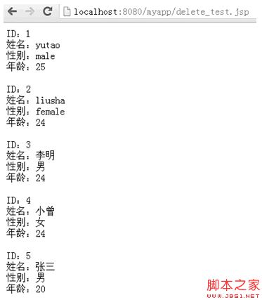 在瀏覽器直接訪問index_test.jsp頁面,點擊刪除按鈕,填入ID或者姓名之中的任何一個并提交即可進行刪除: