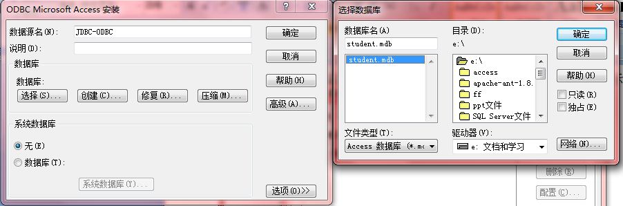 String url = "jdbc:odbc:driver={Microsoft Access Driver (*.mdb)};DBQ="+"e://student.mdb ";