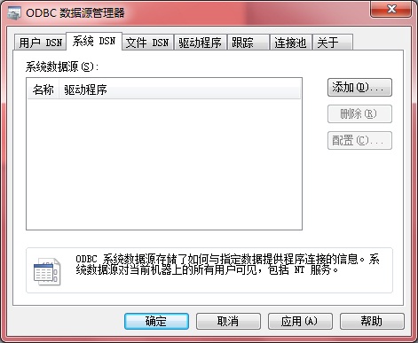 1、對于這種方式,首先要建立ODBC數據源,我的系統是Win7系統,所以依次選擇“控制面板----管理工具----數據源(ODBC)”,打開數據源管理器,如圖所示: